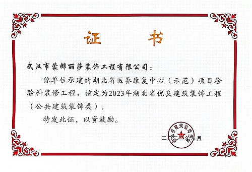 证书介绍 2023年湖北省优良建筑装饰工程荣誉证书 (湖北省医养康复中心示范项目检验科装修工程)