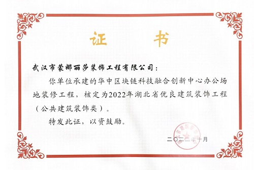 2022年湖北省优良建筑装饰工程荣誉证书 (华中区块链科技融合创新中心办公场地装修工程)