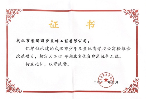 2021年湖北省优良建筑装饰工程荣誉证书 (武汉市少年儿童体育学校公寓楼维修改造项目)