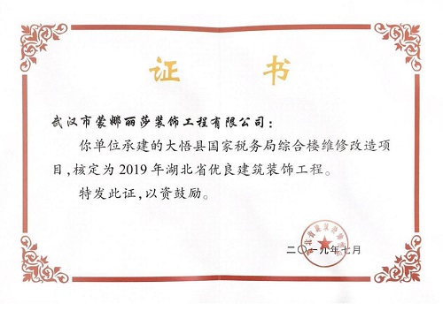 2019年湖北省优良建筑装饰工程荣誉证书 (大悟县国家税务局综合楼维修改造项目)