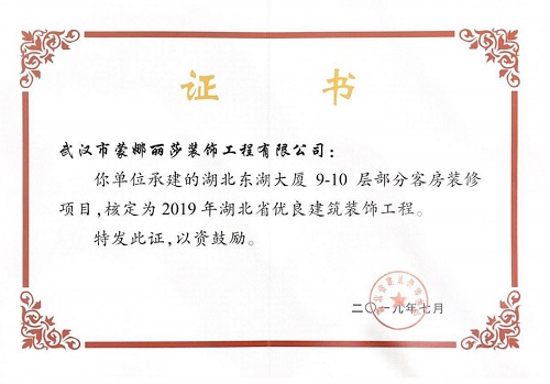 2019年湖北省优良建筑装饰工程荣誉证书 (湖北东湖大厦9-10层部分客房装修项目)