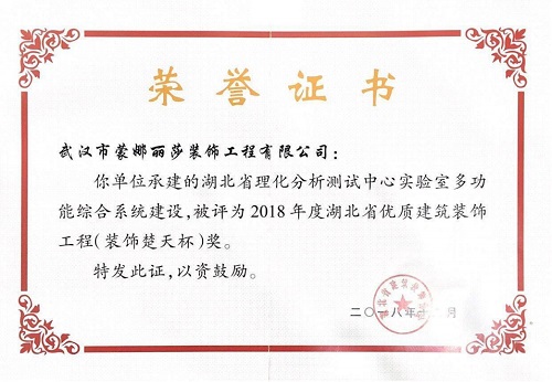 2018年湖北省优良建筑装饰工程荣誉证书 (湖北省理化分析测试中心实验室多功能系统建设)