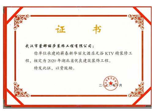 2020年湖北省优良建筑装饰工程荣誉证书 (蕲春新华丽大酒店足浴KTV精装修工程)