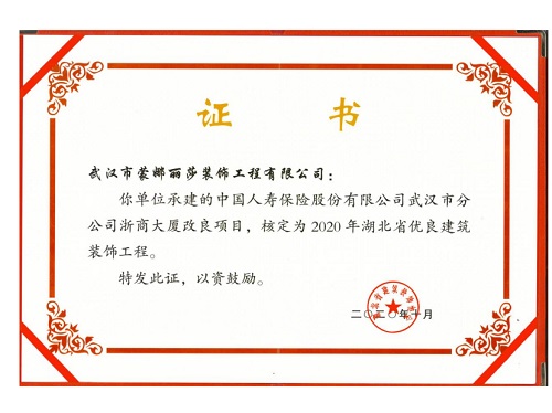 2020年湖北省优良建筑装饰工程荣誉证书 (中国人寿保险股份有限公司武汉市分公司浙商大厦改良项目)