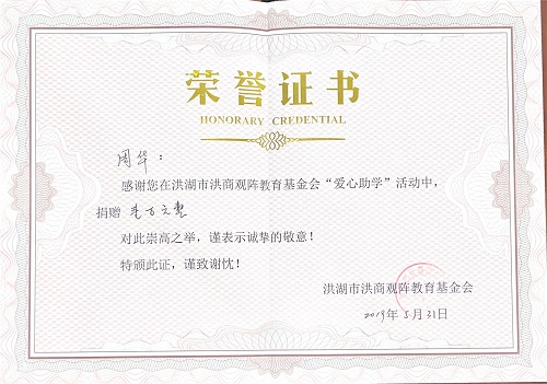 洪湖市洪商观阵教育基金会捐赠壹万元